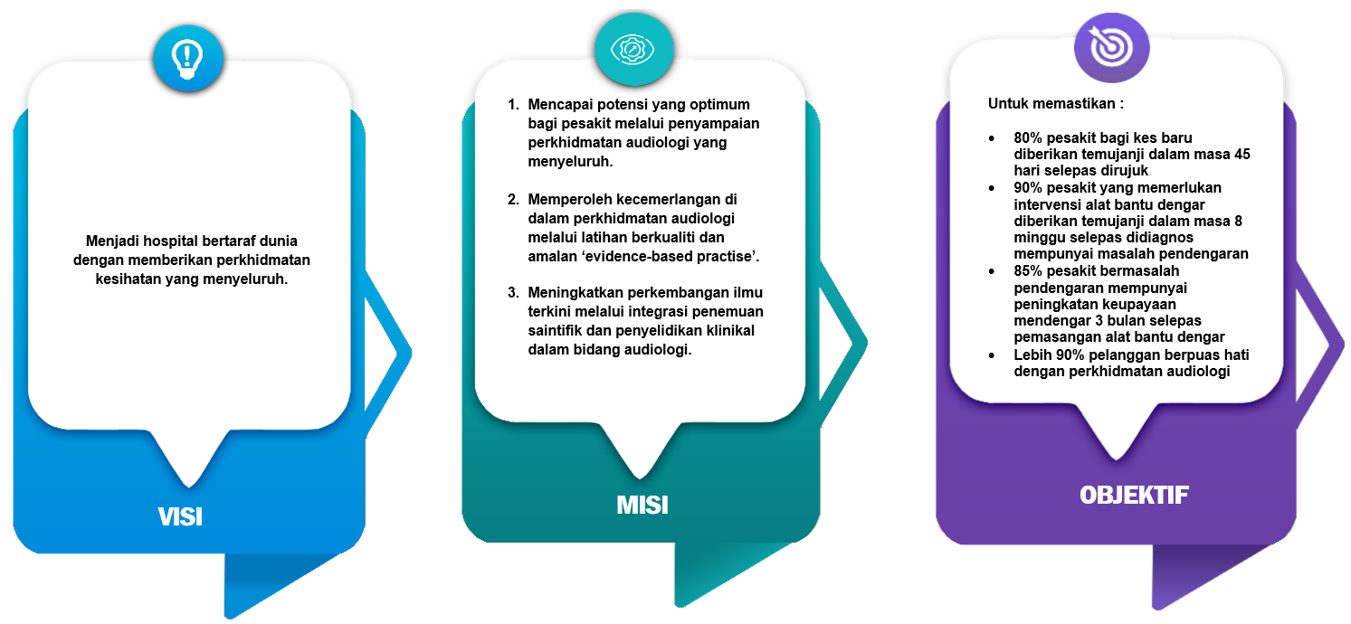 Menyediakan perkhidmatan audiologi yang komprehensif kepada individu yang mengalami masalah pendengaran, gangguan vestibular dan keseimbangan, tinnitus dan gangguan pemprosesan pendengaran melalui penilaian, intervensi awal, kaunseling dan program pendidikan kepada pesakit, ahli keluarga dan komuniti.