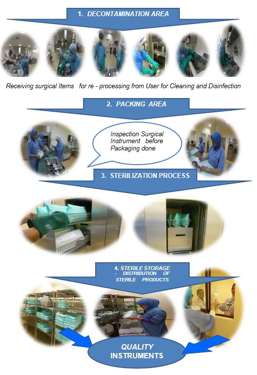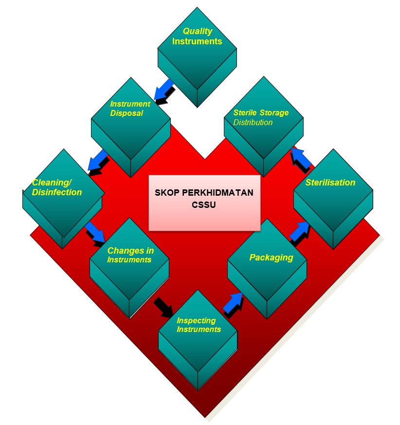 - Sistem Kaunter merangkumi penerimaan surgical instrument yang perlu di proses semula samada yang telah digunakan atau pun yang belum digunakan (pembekalan produk steril bermula dari diterima sehingga produk steril)